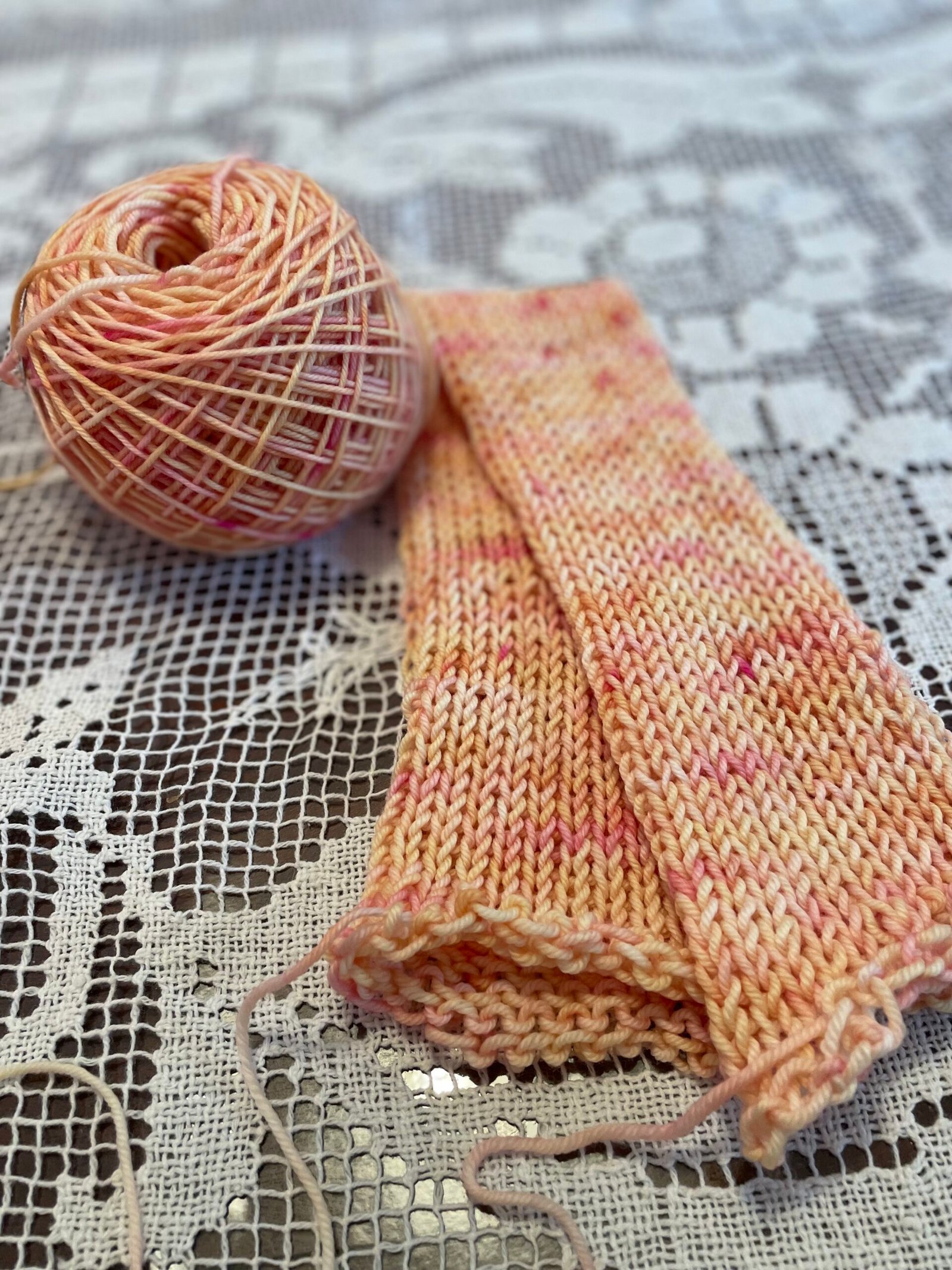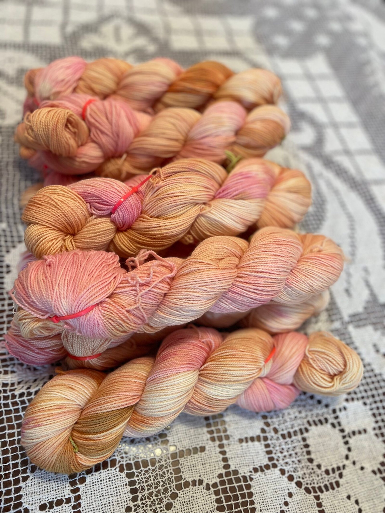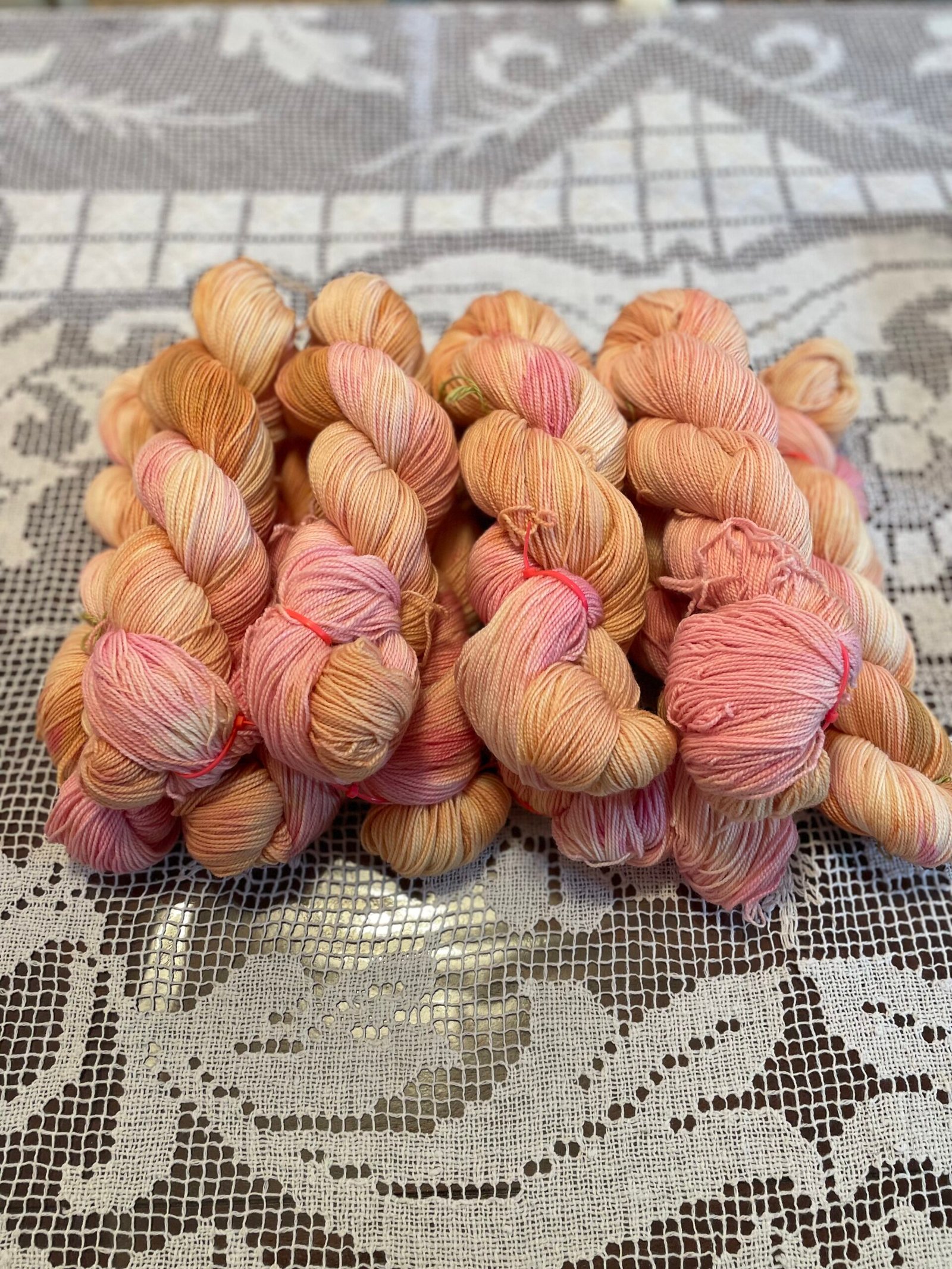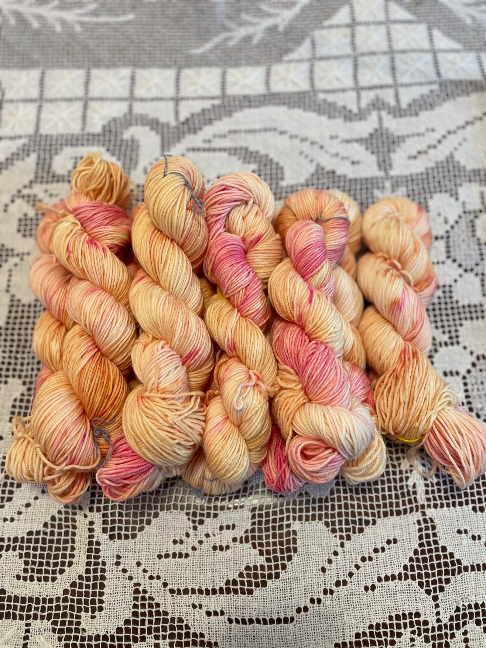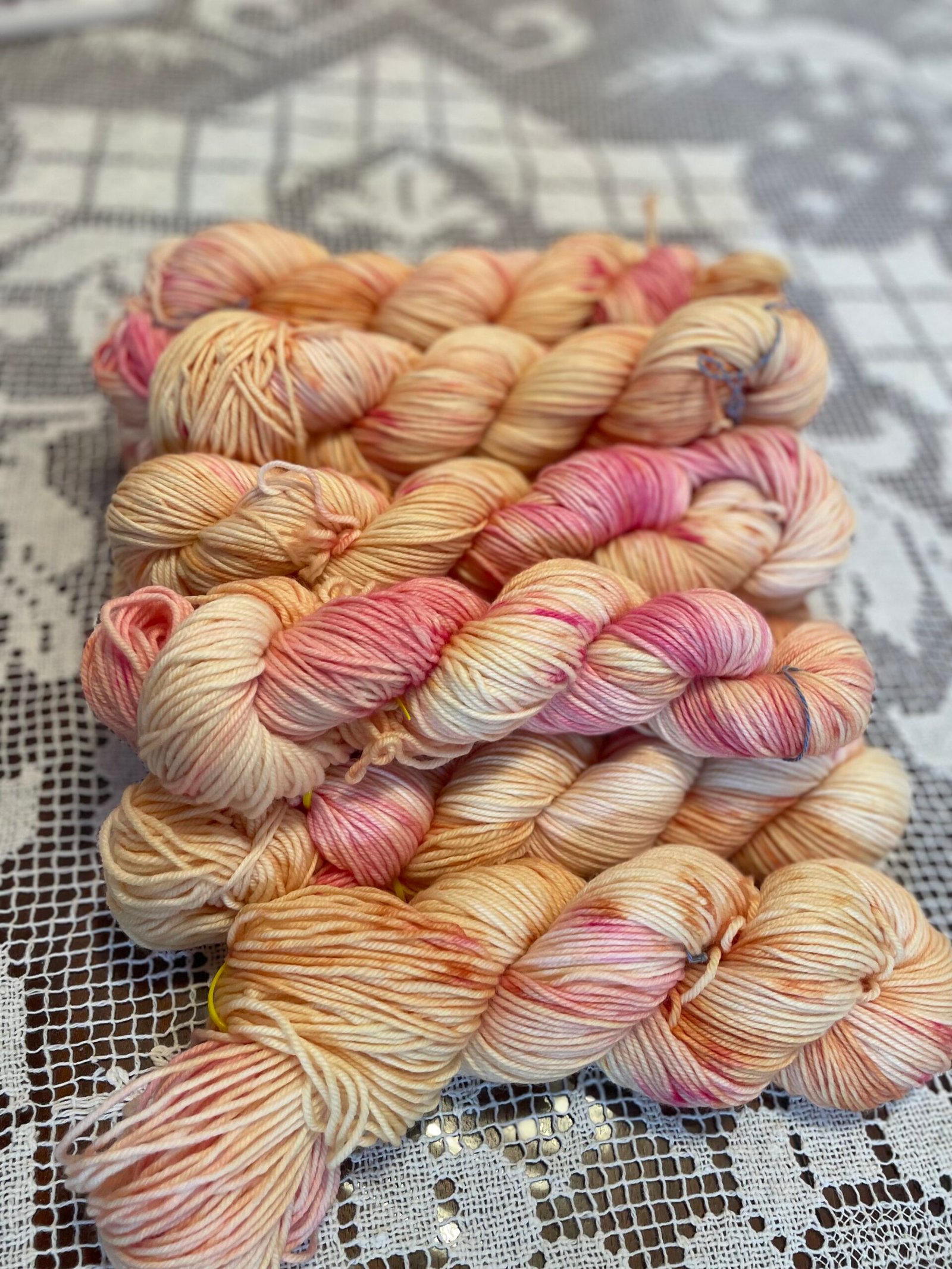 Warm peach, gentle apricot, and blush rose drift across a creamy base like the first glow of morning. Speckles and washes of pink bloom through golden tones, creating a colorway that feels tender, hopeful, and full of quiet possibility.
