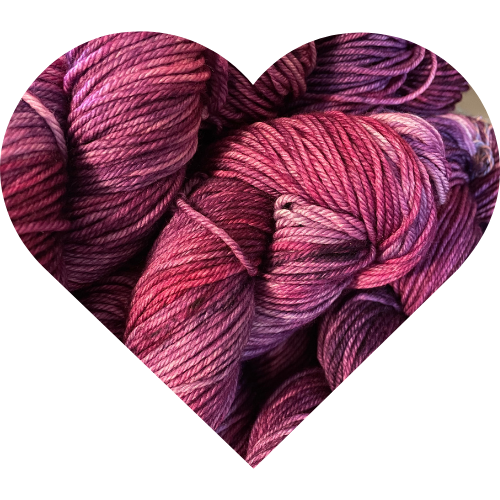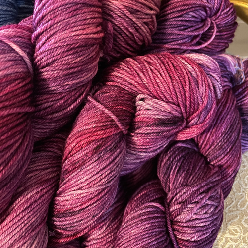 As the yarn moves through your hands, deeper berry and muted purple tones emerge. Because each skein is dyed slowly in small batches, subtle shifts appear across the fiber, creating a richness that feels steady rather than dramatic. These variations give the yarn character while still allowing harmony across a finished piece.